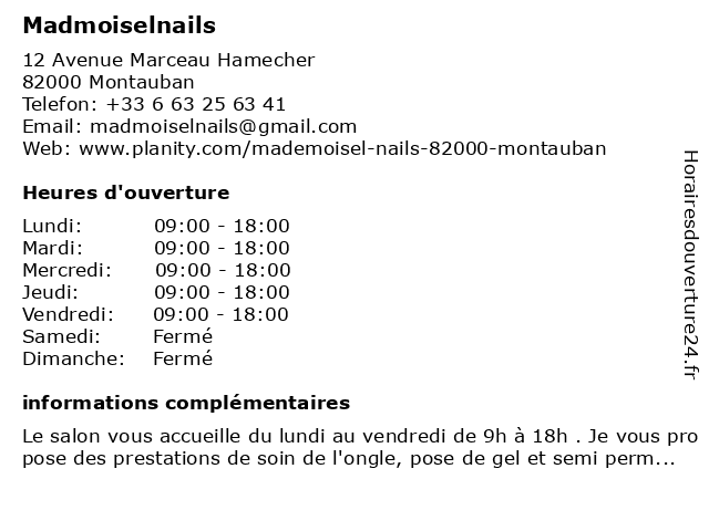 Le salon vous accueille du lundi au vendredi de 9h à 18h . Je vous propose des prestations de soin de l'ongle, pose de gel et semi permanent, pose et rehaussement de cils ainsi que les épilations.