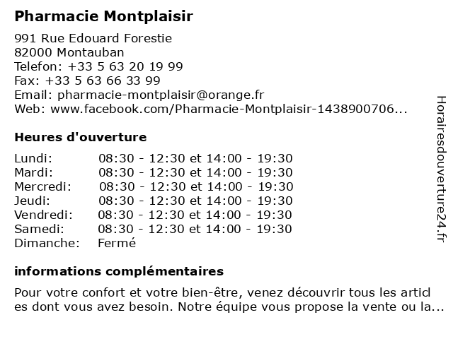 1 Pharmacie Montplaisir (Distance: 0,01 km) 991 Rue Edouard Forestie, 82000 Montauban conseil, montplaisir, ordonnance, parapharmacie, pharmacie, test-antigénique, vaccination 2 AMAP Montplaisir (Distance: 44,98 km) - place Joseph Verseille, 31770 Colomiers amap, bio, fruits, légumes, montplaisir, primeur, producteur 3 1001Pharmacies / Société Belles du monde (Distance: 1,09 km) 93 Boulevard vincent auriol, 82000 Montauban 1001pharmacies, belles, du, la médecine, la pharmacie, la santé, les soins, monde, pharmacie, société 4 1001Pharmacies / Ibbeo-cosmétiques (Distance: 2,56 km) 49 Rue du general Sarrail, 82000 Montauban 1001pharmacies, cosmétiques, ibbeo, la médecine, la pharmacie, la santé, les soins, pharmacie 5 1001Pharmacies / Société Biorgane (Distance: 6,41 km) 1222 Route de Montbartier, 82000 Montauban 1001pharmacies, biorgane, la médecine, la pharmacie, la santé, les soins, pharmacie, société 6 Pharmacie Oldak (Distance: 40,87 km) 2 Allee Emile Zola, 31700 Blagnac beaute, chaussures, decoration, mode enfants, mode femme, mode homme, oldak, pharmacie, restauration, service, sport, telephonie |