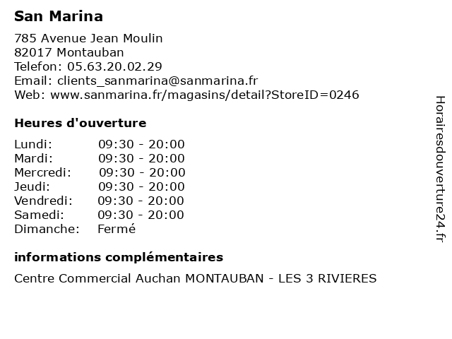 1 San Marina (Distance: 0,95 km) - Montauban 1, 82000 Montauban accessoires femme, chaussures, enfant, homme, marina, san, san marina 2 San Marina (Distance: 5,61 km) 1155 Avenue De L' Europe, 82000 Montauban cafe, chaussures, enfants, lingerie, marina, mode hemmes, mode homme, restaurant, san 3 Marina Mabille - Sage-femme (Distance: 1,63 km) 59 Rue des Saules, 82000 Montauban accompagnement, bien, cocon, femme, mabille, marina, naitre, prado, périnée, rééducation, sage 4 Dr Bastien San Cirilo - Médecin généraliste (Distance: 1,70 km) 100 rue Leon Cladel, 82000 Montauban bastien, cirilo, consultation, docteur, dr, généraliste, med, medecine, medical, médecin, san, traitement 5 Auchan Services (Distance: 0,00 km) 785 Avenue Jean Moulin, 82017 Montauban auchan, beaute, boutiques, cache, chaussures, deco, enfants, mode femme, mode hommes, restaurant, services, sport 6 Cash Convertes (Distance: 0,00 km) 785 Avenue Jean Moulin, 82017 Montauban beaute, boutiques, cache, cash, chaussures, convertes, deco, enfants, mode femme, mode hommes, restaurant, sport |