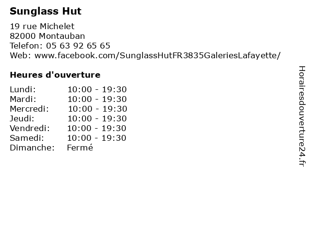 1 Sunglass Hut (Distance: 0,02 km) 37-39 Rue Bessières, 82000 Montauban femme, homme, hut, lunettes, optique, solaires, sunglass 2 Optic 2000 (Distance: 37,61 km) . Avenue des Terres Noires, 81370 Saint-Sulpice 2000, lunettes, optic, santé, solaires 3 Optique du Château (Distance: 39,26 km) 4 place Nougein, 31140 Aucamville château, du, lentilles, lunettes, opticien, optique, progressif, solaires, verre, vue 4 Optic 2000 (Distance: 41,38 km) 2 Allée des Nymphéas, 31240 L'Union 2000, lunettes, optic, santé, solaires 5 Optic 2000 (Distance: 45,22 km) 3 Passage du Ségala, 31770 Colomiers 2000, lunettes, optic, santé, solaires 6 Optic 2000 (Distance: 46,60 km) 7 Avenue Pierre Coupeau, 31130 Balma 2000, lunettes, optic, santé, solaires |