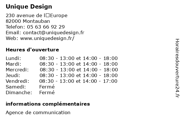 | Lundi | 08:30-13:00 et 14:00-18:00 |