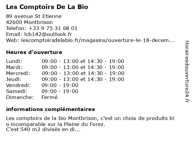 1 Les Comptoirs de la Bio - Montbrison (Distance: 0,47 km) Avenue de St Etienne, 42600 Montbrison bio, comptoirs, cosmétique bio, de, la, les, les comptoirs de la bio, magasin bio, magasin bio 42, magasin bio 42600, magasin bio montbrison, magasin bio à proximité, montbrison, vrac 3 Mon Enfant Bio (Distance: 13,69 km) - Zone de la Tuilerie, 42130 Marcoux bio, bébés, cosmétique, crème, enfant, fabrication, huile, marcoux, mon 5 Le Grand Panier Bio (Distance: 18,31 km) 4 rue Dorine Bourneton, 42160 Andrézieux-Bouthéon alimentation, bio, grand, le, magasin, panier, supermarché, épicerie 6 Bio Forum (Distance: 19,84 km) 8 Rue du Huit Mai, 42110 Feurs alimentation, bio, forum, local, vrac, épicerie |