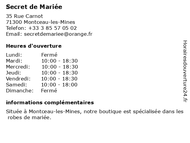 1 Secret Alibi (Distance: 39,58 km) - Rue Thomas Dumorey, 71100 Chalon sur Saone accessoires, alibi, bijouterie, bijoux, secret 2 Jardin Secret (Distance: 41,73 km) 31 grande rue, 71380 Saint marcel cheveux, coiffeur, jardin, perruque, secret |