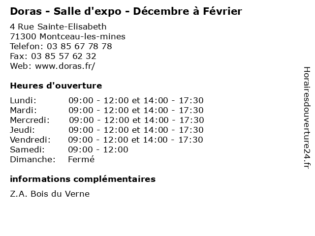 1 Doras - Salle d'expo - Mars à Novembre (Distance: 0,00 km) 4 Rue Sainte-Elisabeth, 71300 Montceau-les-Mines cloisons, d'expo, de, doras, fin, horaire, mars, menuiserie, novembre, outillage, salle, travaux 2 Doras Montceau-les-Mines (Distance: 0,05 km) 4 Rue Sainte-Elisabeth, 71300 Montceau-les-Mines doras, les, mines, montceau 3 Centre de Vaccination COVID-19 - Salle l’Embarcadère (Distance: 1,51 km) 36 Quai Jules Chagot, 71300 Montceau-les-Mines 19, centre, covid, covid 19, covid19, de, l’embarcadère, médecin, médecine, médical, salle, test, vaccin, vaccination, vaccins 4 5 Doras - Hiver - Décembre à Février (Distance: 12,66 km) 47 rue des Abattoirs, 71200 Le Creusot cloisons, de, doras, décembre, fin, février, hiver, menuiserie, outillage, travaux 6 Cimetière Saint-Laurent - du 2 novembre au 28 février (Distance: 13,25 km) - Chemin du Cimetière Saint-Laurent, 71200 Le Creusot 28, au, chapelle, christianisme, chrétien, cimetière, du, février, laurent, novembre, paroisse, pasteur, religion, saint, église |