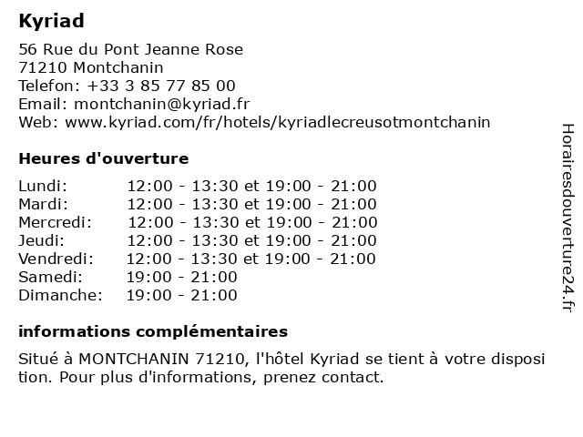 1 Hotel Kyriad Chalon Sur Saone Centre (Distance: 28,12 km) 35 Place de Beaune, 71100 Chalon-sur-Saône bar, centre, chalon, hotel, kyriad, restaurant, saone, service, sur 2 Hotel Kyriad Beaune (Distance: 39,23 km) 10 Rue Yves Bertrand Burgalat, 21200 Beaune beaune, cafe, hotel, kyriad, restaurant, service 3 Hôtel Kyriad (Distance: 55,65 km) 3 Rue Du 19 Mars 1962, 71000 Mâcon bar, hotel, hôtel, kyriad, restaurant, service |