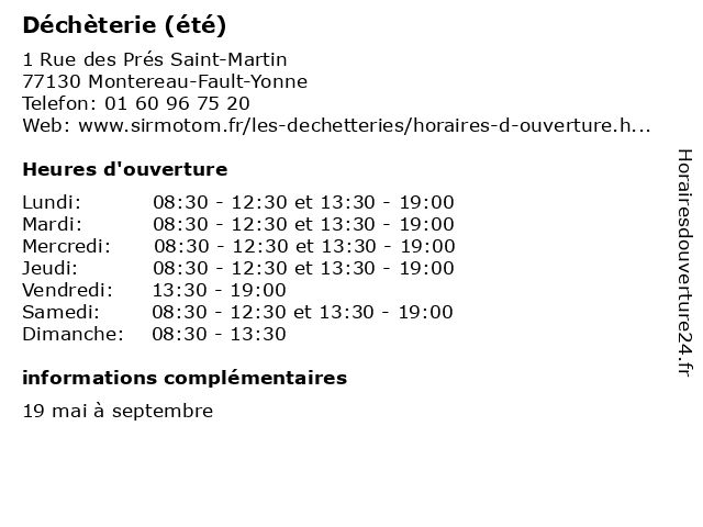 1 Déchèterie (Été) (Distance: 8,73 km) - Rue des Prés de Pâques, 89340 Villeneuve-La-Guyard bennes, débarras, déchèterie, détritus, ordures, été 2 Déchèterie (Été) (Distance: 11,62 km) - Route de Saint-Ange, 77940 Voulx collecte, décheterie, déchèterie, gravat, tri, été 3 Déchèterie (Été) (Distance: 19,83 km) - Rue des Soixante Arpents, 77780 Bourron-Marlotte bennes, collecte, déchèterie, gravats, recyclage, été 4 Déchèterie (hiver) (Distance: 0,00 km) 1 Rue des Prés Saint-Martin, 77130 Montereau-Fault-Yonne collecte, décheterie, déchèterie, gravat, hiver, tri 5 Déchèterie (Hiver) (Distance: 8,73 km) - Rue des Prés de Pâques, 89340 Villeneuve-La-Guyard bennes, débarras, déchèterie, détritus, hiver, ordures 6 Déchetterie (été) (Distance: 9,58 km) - Rue Monchavant, 77250 Écuelles collecte, dechetterie, déchets, déchetterie, recyclage, tri, été |