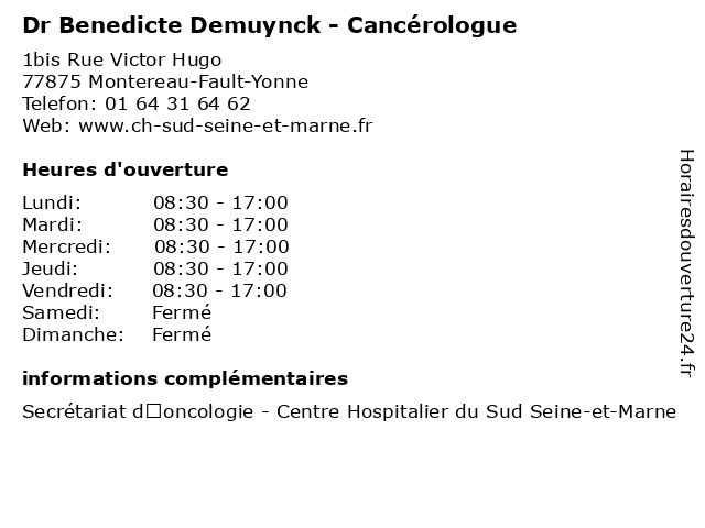 1 Dr Marie Chaubet-Houdu - Cancérologue (Distance: 0,00 km) 1bis Rue Victor Hugo, 77875 Montereau-Fault-Yonne cancérologue, ch, chaubet, chimiothérapie, dr, du, et, fault, houdu, hémopathie, immunothérapie, marie, marne, montereau, oncologie, oncologue, seine, sud, yonne 2 Dr Clémentine Borin-Gourbeix - Cancérologue (Distance: 18,79 km) 4 Rue Lagorsse, 77300 Fontainebleau borin, cancérologue, clémentine, consultation, docteur, dr, gourbeix, med, médecin, médecine, secrétariat, traitement 3 Dr Marie Chaubet Houdu - Cancérologue (Distance: 19,10 km) 55 Boulevard du Maréchal Joffre, 77300 Fontainebleau cancérologue, ch, chaubet, chimiothérapie, dr, du, et, fontainebleau, houdu, hémopathie, immunothérapie, marie, marne, oncologie, oncologue, seine, sud 4 Dr Jean-Pierre Grapin - Cancérologue (Distance: 19,10 km) 55 Boulevard du Maréchal Joffre, 77300 Fontainebleau cancérologue, ch, chimiothérapie, dr, du, et, fontainebleau, grapin, hémopathie, immunothérapie, jean, marne, oncologie, oncologue, pierre, seine, sud 5 Dr Clémentine Borin-Gourbeix - Cancérologue (Distance: 19,10 km) 55 Boulevard du Maréchal Joffre, 77300 Fontainebleau borin, cancérologue, ch, chimiothérapie, clémentine, dr, du, et, fontainebleau, gourbeix, hémopathie, immunothérapie, marne, oncologie, oncologue, seine, sud 6 Dr Adriana Muresan - Cancérologue (Distance: 19,10 km) 55 Boulevard du Maréchal Joffre, 77300 Fontainebleau adriana, cancérologue, ch, chimiothérapie, dr, du, et, fontainebleau, hémopathie, immunothérapie, marne, muresan, oncologie, oncologue, seine, sud |