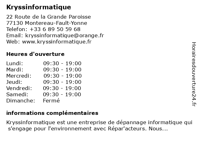 1 Kryssinformatique (Distance: 0,00 km) 22 Route de la Grande Paroisse, 77130 Montereau-Fault-Yonne kryssinformatique |