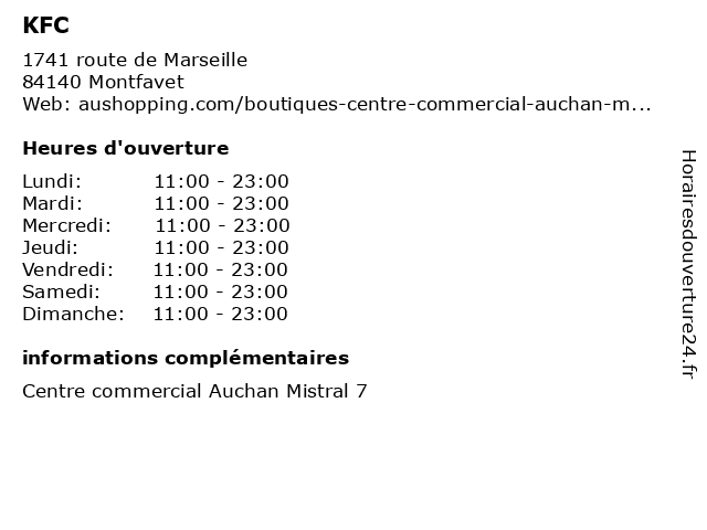 1 KFC (Distance: 11,64 km) . rond point Péage A7 nord, 84700 Sorgues boissons, burger, fastfood, frites, kfc, restaurant 2 KFC (Distance: 11,81 km) 2 Rue Des Alizées, 30133 Les Angles burgers et buckets, fastfood, frites, kfc, poulet et bucket, restaurant 4 KFC Avignon Mistral (Distance: 2,30 km) 600 Chemin de l'Herbe, 84140 Avignon avignon, burgers et buckets, fastfood, frites, kfc, mistral, poulet et bucket, restaurant 5 KFC Avignon Sorgues (Distance: 7,98 km) Voie Rapide Avignon-Carpentras, 84700 Sorgues avignon, kfc, sorgues 6 KFC Drive (Distance: 11,64 km) . rond point Péage A7 nord, 84700 Sorgues boissons, burger, drive, fastfood, frites, kfc, restaurant |