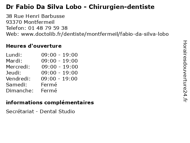 1 Dr Fabio Da Silva Lobo - Chirurgien-dentiste (Distance: 6,08 km) 10 Avenue des Chênes, 77270 Villeparisis chirurgien, consultation, da, dentiste, docteur, dr, fabio, lobo, med, médecin, silva, traitement 2 Da Vincenzo (Distance: 4,53 km) 113 Promenade Hermann Regnier, 93460 Gournay Sur Marne da, restaurants, vincenzo 3 Dr José Malheiro Da Silva - Médecin généraliste (Distance: 6,48 km) 38 Avenue de la République, 93140 Bondy da, docteur, dr, généraliste, généraux, josé, malheiro, médecin, silva, soins 4 Dr Joana da Silva - Chirurgien-dentiste (Distance: 7,90 km) 108 Rue Jean Jaurès, 93130 Noisy-le-Sec chirurgie, chirurgien, da, dentaire, dentiste, dr, joana, silva 5 Fabio Lucci (Distance: 8,88 km) - Boulevard Maurice Thorez, 93000 Bobigny equipement, fabio, lucci, maison 6 Da Cunha Alice Claudine (Distance: 12,74 km) 17 Rue Francois De Paule, 94490 Ormesson Sur Marne alice, claudine, cunha, da, restaurants |