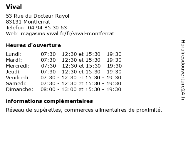 1 Vival (Distance: 9,13 km) - Centre Commercial des Colettes, 83300 Draguignan supermarché, supérette, vival, épicerie 2 Vival (Distance: 16,68 km) n/a Place Emile, 26740 Marsanne bread, deli, fish shop, gas bottles, photocopy, removing packages, vival, wine cellar 3 Vival (Distance: 17,40 km) , Route de la Bouverie, 83480 Puget-sur-Argens bread, deli, fish shop, gas bottles, photocopy, removing packages, vival, wine cellar 5 Vival by Casino (Distance: 20,76 km) - Avenue Georges Clemenceau, 83630 Aups by, casino, droguerie, d’hypermarchés, frais, fruits et légumes, hygiène, parfumerie et autres produits non alimentaires., surgelés, vival, épicerie 6 Vival by Casino (Distance: 21,87 km) 3 Rue des Maisons Neuves, 83440 Callian by, casino, droguerie, d’hypermarchés, frais, fruits et légumes, hygiène, parfumerie et autres produits non alimentaires., surgelés, vival, épicerie |