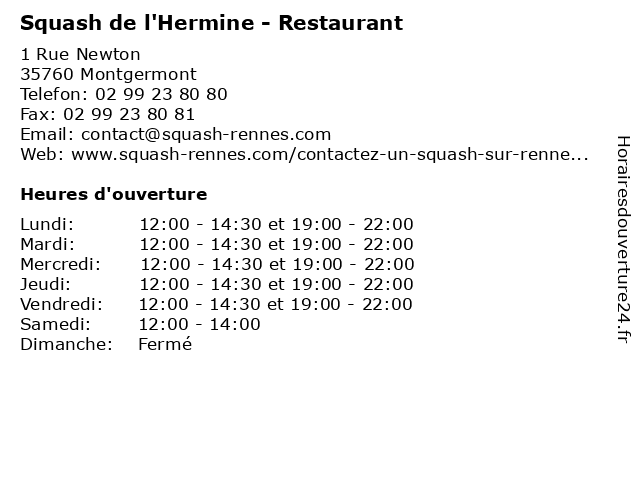 Termes de recherche pour Squash de l'Hermine - Restaurant:restaurant, du, de, d'ouverture, club, ecole, heures, squash, l'hermine, equipes |