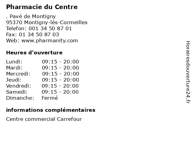 1 Pharmacie du Centre (Distance: 0,42 km) - boulevard Victor Bordier, 95370 Montigny les Cormeilles centre, du, la médecine, la pharmacie, la santé, les soins, pharmacie 2 Pharmacie du Centre (Distance: 2,58 km) 13 rue du Général de Gaulle, 95220 Herblay centre, du, herboristerie, médicaments, paramédical, parapharmacie, pharmacie, pharmacien, santé, traitements 3 Pharmacie du Centre (Distance: 4,38 km) 88 Rue d'Ermont, 95390 Saint Prix centre, du, herboristerie, médicaments, paramédical, parapharmacie, pharmacie, pharmacien, santé, traitements 4 Pharmacie du Centre (Distance: 8,30 km) 1 Rue du Bas Noyer, 95610 Éragny beaute, centre, chaussures, decoration, du, mode enfants, mode femme, mode homme, pharmacie, restauration, service, sport, telephonie 5 Pharmacie du Centre (Distance: 11,27 km) 8 avenue d'Argenteuil, 92600 Asnières sur Seine centre, du, homéopathie, médicaments, orthopédie, parapharmacie, pharmacie 6 Pharmacie du centre (Distance: 13,19 km) 1 Place Du Caquet, 93200 Saint-Denis cafe, centre, chaussures, du, enfants, homme, mode femme, parfumeries, pharmacie, restaurant, servicies, sport |