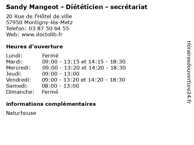 1 Fanny Coquerel - Diététicien - secrétariat (Distance: 2,63 km) 13 Rue Haute Seille, 57000 Metz cabinet, coquerel, diététicien, diététique, fanny, medical, secrétariat 2 Joëlle Mangeot - Sage-femme (Distance: 6,71 km) 1 Allée du Château, 57530 Ars-Laquenexy consultation, docteur, dr, femme, joelle, joëlle, mangeot, med, médecin, sage, traitement 3 Nadjim Kherroub - Diététicien (Distance: 16,02 km) 47 Rue de l'Europe, 57360 Amnéville alimentation, dieteticien, diététicien, kherroub, nadjim, nourriture, sante 4 François Debras - Diététicien (Distance: 17,18 km) 3c Rue Jules Massenet, 57120 Rombas aliment, debras, dieticien, diététicien, françois, medecin, nutrition 5 Naturhouse (Distance: 0,00 km) 20 Rue de l'Hôtel de Ville, 57950 Montigny-lès-Metz alimentation, diététique, minceur, natur house, naturhouse, naure, nutrition, produits 6 Dietplus (Distance: 1,30 km) 331 rue de Pont-A-Mousson, 57950 Montigny-Les-Metz alimentation, dietplus, diététique, fitness, nutrition |