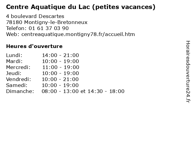 1 Centre Aquatique du Lac (Périodes Scolaires) (Distance: 0,00 km) 4 boulevard Descartes, 78180 Montigny-le-Bretonneux aquatique, centre, du, lac, periode, piscine, périodes, récréative, scolaire, scolaires 2 Centre Aquatique du Lac (Vacances Estivale) (Distance: 0,00 km) 4 boulevard Descartes, 78180 Montigny-le-Bretonneux aquatique, centre, du, estivale, lac, piscine, récréative, vacances 3 École élémentaire publique du Lac (Distance: 0,90 km) . Rue des Quatre Vents, 78960 Voisins-le-Bretonneux cours, du, education, lac, publique, services, école, élémentaire 4 Yespark, location de parking au mois - Lac de la Sourderie (Distance: 0,93 km) 57 Avenue Joseph Kessel, 78180 Montigny-le-Bretonneux au, de, la, lac, location, mois, parking, sourderie, yespark 5 École maternelle publique du Lac (Distance: 0,94 km) 1 Rue des Quatre Vents, 78960 Voisins-le-Bretonneux cours, du, education, lac, maternelle, publique, services, école 6 Yespark, location de parking au mois - Le Pas du Lac - Montigny-le-Bretonneux (Distance: 2,84 km) 6 Avenue de Denton, 78180 Montigny-le-Bretonneux au, bretonneux, de, du, lac, le, location, mois, montigny, parking, pas, yespark |
