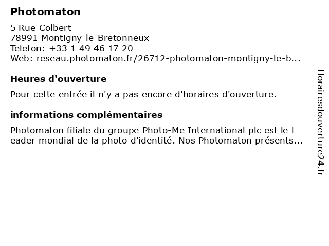 2 Photomaton (Distance: 0,34 km) 5 Place Colbert, 78885 Saint-Quentin cafe, enfants, homme, mode femme, photomaton, restaurant, servicies 6 Photomaton (Distance: 7,34 km) 161 Chemin départemental, 78370 Plaisir cafe, chaussures, enfants, homme, mode femme, photomaton, restaurant, service, sport |