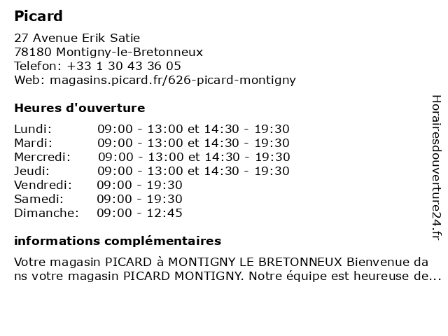 Votre magasin PICARD à MONTIGNY LE BRETONNEUX Bienvenue dans votre magasin PICARD MONTIGNY. Notre équipe est heureuse de vous accueillir et pourra vous conseiller avec professionnalisme et en tou...