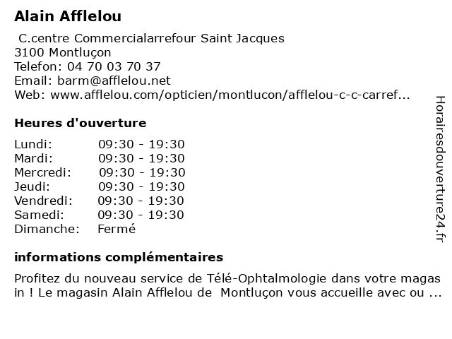 1 Alain Afflelou (Distance: 0,01 km) 15 Rue Pablo Picasso, 03100 Montluçon afflelou, alain, lunettes, opticien, optique 2 Alain Afflelou (Distance: 2,70 km) Centre Commercial Auchan, 03410 Domérat afflelou, alain, magasin de lunettes de soleil, magasin d’accessoires de mode, optométrie 3 Alain Afflelou (Distance: 2,77 km) 65 avenue des Martyrs, 03410 Domerat afflelou, alain, lunettes, opticien, optique 4 Claro Afflelou (Distance: 0,30 km) 13 Rue Albert Einstein, 03100 Montluçon afflelou, child, claro, men, optical, women 6 Dr Alain Schils - Médecin généraliste (Distance: 0,93 km) 2 Rue Porte des Forges, 03100 Montluçon alain, docteur, dr, generaliste, généraliste, medical, médecin, schils, soin |