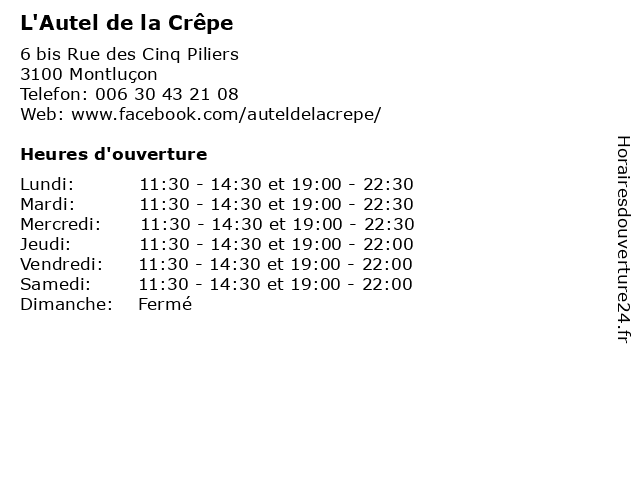 | Mardi | 11:30-14:30 et 19:00-22:30 |