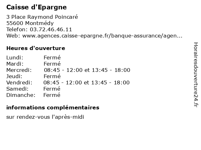 1 Caisse d'Epargne (Distance: 13,20 km) 41 Place de la République, 55700 Stenay banque, caisse, carte, d'epargne, services 2 Caisse d'Epargne (Distance: 18,84 km) 12 Rue De L Hotel De Ville, 54260 Longuyon assurances, banques, caisse, d'epargne, services 3 Caisse d'Epargne (Distance: 19,19 km) 7 Place de la Fontaine, 08110 Carignan assurances, banques, caisse, d'epargne, services 4 Caisse Primaire D'Assurance Maladie (Distance: 13,19 km) 8 Vauban, 55700 Stenay administration, assoc, caisse, d'assurance, maladie, primaire, services, services publics 5 Caisse D'Allocations Familiales (CAF) (Distance: 18,77 km) 1 place de l'Hôtel-de-Ville, 54200 Longuyon allocations, caf, caisse, d'allocations, de, et, familiales, longuyon, meurthe, moselle 6 Crédit Agricole Lorraine (Distance: 0,07 km) 7 Place Raymond Poincaré, 55600 Montmédy agence, agricole, assurance, bancaire, banque, crédit, lorraine |
