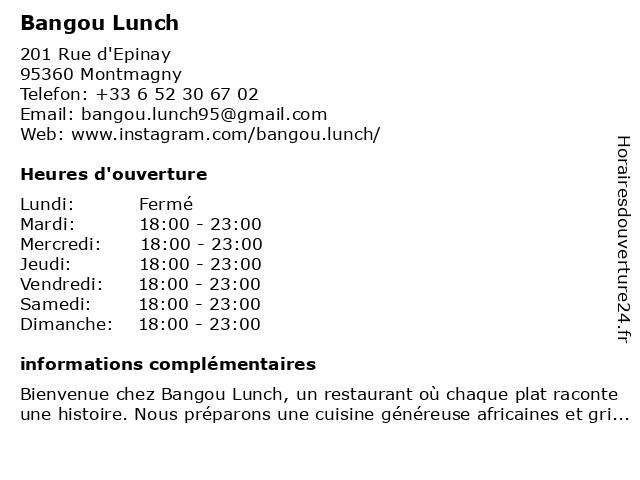 2 Lunch Grill (Distance: 4,05 km) 8/9 Quai du Chatelier, 93450 L'Ile Saint Denis beaute, chaussures, grill, lingerie, lunch, mode enfants, mode femmes, mode hommes, sport 3 Véli'Lunch (Distance: 4,55 km) 1 rue Fournier Lecuyer, 95140 Garges-lès-Gonesse fait maison, fast food, français, restaurant, restauration rapide, véli'lunch 5 Restaurant Bangou (Distance: 8,07 km) 49 Rue Marcadet, 75018 Paris africain, bangou, bistrot, brasserie, restaurant, restaurants, restauration 6 |