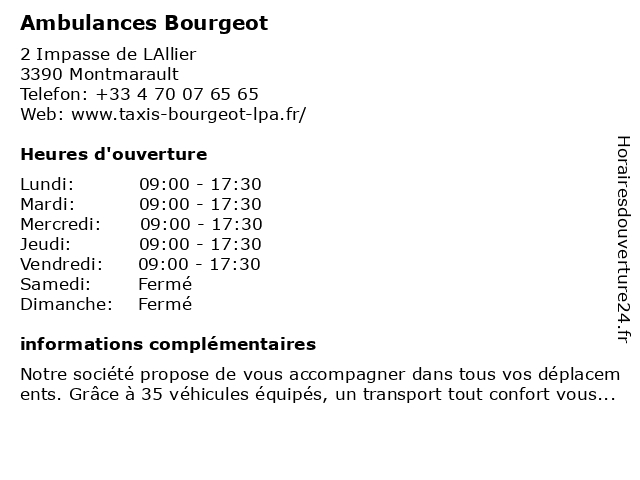 3 Ambulances Taxi Bellenave 03 (Distance: 16,30 km) 1 Rue des Forges, 03330 Bellenaves 03, ambulances, bellenave, taxi 5 TSM Ambulances (Distance: 27,04 km) 1 Rue Ambroise Croizat, 03630 Desertines ambulances, desertines, service, tsm, urgence 6 Ambulances de l'Andelot (Distance: 27,93 km) 2 Rue Eugène Rouher, 03110 Broût-Vernet ambulances, andelot, broût-vernet, de, l'andelot, service, transport, urgence  |