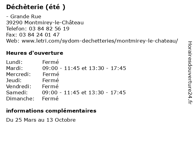 1 Déchèterie (été ) (Distance: 12,59 km) 22 allée du Bois, 39100 Brevans déchèterie, gravats, huiles usées, la réception des déchets et écocentres, les appareils électroménagers, les déchets verts, papier et carton en quantité, été 2 Déchèterie (été ) (Distance: 17,18 km) 6, chemin du Tissage, 39700 Dampierre déchèterie, gravats, huiles usées, la réception des déchets et écocentres, les appareils électroménagers, les déchets verts, papier et carton en quantité, été 3 Déchèterie (hiver ) (Distance: 0,00 km) - Grande Rue, 39290 Montmirey-le-Château déchèterie, gravats, hiver, huiles usées, la réception des déchets et écocentres, les appareils électroménagers, les déchets verts, papier et carton en quantité 4 Déchèterie (Été) (Distance: 7,98 km) - rue principale, 39350 Saligney déchèterie, ete, gravats, huiles usées, la réception des déchets et écocentres, les appareils électroménagers, les déchets verts, papier et carton en quantité, été 5 Déchèterie (Hiver) (Distance: 7,98 km) - rue principale, 39350 Saligney déchèterie, gravats, hiver, huiles usées, la réception des déchets et écocentres, les appareils électroménagers, les déchets verts, papier et carton en quantité 6 Déchèterie (hiver ) (Distance: 12,59 km) 22 Allée du Bois, 39100 Brevans déchèterie, gravats, hiver, huiles usées, la réception des déchets et écocentres, les appareils électroménagers, les déchets verts, papier et carton en quantité |