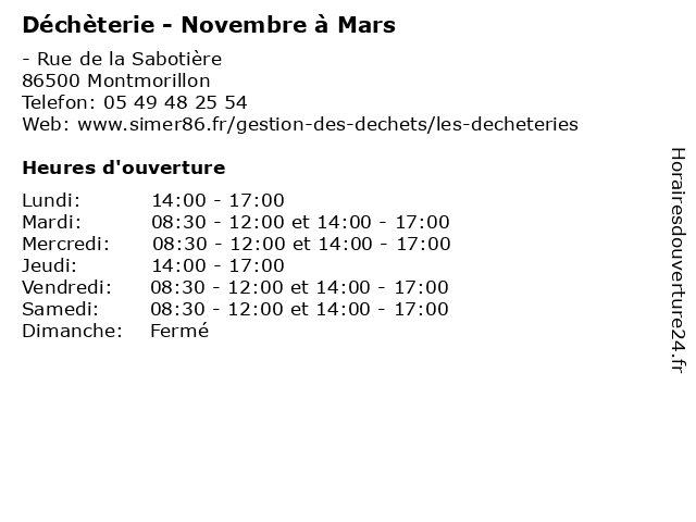 1 Déchèterie - Novembre à Mars (Distance: 11,22 km) - Route du Blanc, 86290 La Trimouille benne, débarras, déchets, déchèterie, détritus, mars, novembre 2 Déchèterie - Novembre à Mars (Distance: 11,76 km) 12 Route d'Abenoux, 86390 Lathus-Saint-Rémy benne, débarras, déchets, déchèterie, détritus, mars, novembre 3 Déchèterie - Novembre à Mars (Distance: 13,59 km) - Rue de la Verdrie, 86320 Lussac-les-Châteaux benne, débarras, déchets, déchèterie, détritus, mars, novembre 4 Déchèterie - Novembre à Mars (Distance: 14,79 km) - za La Croix de Pierre, 86310 Saint-Savin benne, débarras, déchets, déchèterie, détritus, mars, novembre 5 Déchèterie - Avril à Octobre (Distance: 0,00 km) - Rue de la Sabotière, 86500 Montmorillon avril, benne, débarras, déchets, déchèterie, détritus, octobre 6 Déchèterie (Distance: 11,46 km) - de Bourg-Archambault, 86390 Bourg-Archambault déchèterie, gravats, huiles usées, la réception des déchets et écocentres, les appareils électroménagers, les déchets verts, papier et carton en quantité |