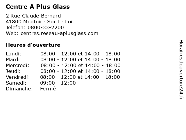 2 Point S Glass (Distance: 18,95 km) 13 Rue des Terres Blanches, 37110 Le Boulay auto, centre, glass, pare brise, point, réparation 3 Centre A Plus Glass (Distance: 20,73 km) . La Chasselouvière, 72120 Saint Calais automobiles, centre, garage, glass, motos, pare brise, plus 5 Point S Glass (Distance: 39,14 km) - Rue Edouard Branly, 41000 Blois auto, centre, glass, pare brise, point, réparation 6 Sun Glass Auto Tours (Distance: 39,64 km) 1 Rue Guy Baillereau, 37540 Saint-Cyr-sur-Loire auto, glass, sun, tours |