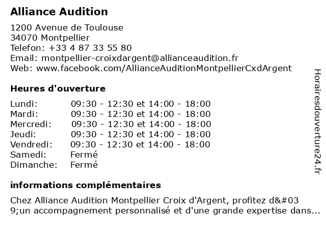 2 Alliance Audition (Distance: 18,87 km) 66 Rue Frédéric Mistral, 34280 La Grande-Motte alliance, audition 3 Audition Mutualiste - MAISON DE LA MUTUALITE (Distance: 1,79 km) 88, rue de la 32ème, 34264 Montpellier accessories, aids auditive, audition, de, hear assessment, hearing aids, hearing protection, la, maison, mutualiste, mutualite 4 Audioprothésiste Krys Audition (Distance: 2,23 km) Route De Sète, 34430 Saint-jean-de-védas audiologie, audioprothésiste, audition, krys 6 Blabla Audition (Distance: 2,58 km) 1359 chemin de Moularès, 34070 Montpellier appareil, audition, blabla, ecouter, lunettes, monture, opticien, optique, voir, écouter |