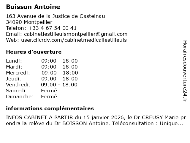 1 Dr Antoine Avignon - Endocrinologue (Distance: 1,59 km) 371 avenue du Doyen Gaston Giraud, 34295 Montpellier antoine, avignon, consultation, docteur, dr, endocrinologue, med, médecin, médecine, traitement 2 Maître Paul-Antoine Sagnes - Avocat (Distance: 1,63 km) 6 rue Richer de Belleval, 34000 Montpellier antoine, avocat, avocats, civils, droits, juridiques, maître, paul, sagnes 3 Maître Virginie Antoine - Avocate (Distance: 2,23 km) 24 Boulevard du Jeu de Paume, 34000 Montpellier antoine, avocate, avocats, civils, droits, juridiques, maître, virginie 4 Maître Antoine Sillard - Avocat (Distance: 2,35 km) 15 rue du Général Campredon, 34000 Montpellier antoine, avocat, avocats, civils, droits, juridiques, maître, sillard 5 Dr Marc-Antoine Chatel - Ophtalmologiste (Distance: 2,41 km) 9 Rue de la République, 34000 Montpellier antoine, care, chatel, clinic, dentist, dermatologue, dr, france, gynécologue, health, kinesitherapeute, marc, ophtalmologiste, orl, psychologue, service 6 Antoine Et Jonathan (Distance: 2,52 km) 13 Rue Du Grand Saint Jean, 34000 Montpellier antoine, jonathan, restaurants |