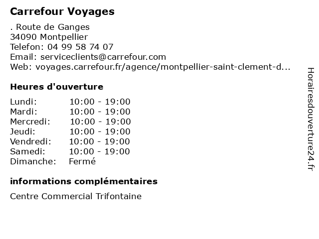 1 Carrefour Voyages (Distance: 7,26 km) . Route de Carnon, 34970 Lattes agences, carrefour, location, vacances, voyages 2 Carrefour Voyages (Distance: 8,88 km) - Route de Sete, 34430 Saint Jean De Vedas billets, carrefour, vacances, voyages 3 Carrefour (Distance: 0,00 km) . Route de Ganges, 34980 Saint-Clément-de-Rivière cafe, carrefour, carrefur, enfants, homme, mode femme, restaurant, servicies 4 Station Velo TAM Voyages Fac des Sciences (Distance: 0,41 km) 2 Place Eugène Bataillon, 34090 Montpellier bike, des, drive, espace vert, fac, nature, parc, sciences, service, station, tam, velo, voyages 5 Station Velo TAM Voyages Fac de Lettres (Distance: 0,91 km) - Place de la Voie, 34090 Montpellier bike, de, drive, espace vert, fac, lettres, nature, parc, service, station, tam, velo, voyages 6 Station Velo TAM Voyages Hôtel du Département (Distance: 1,11 km) - Avenue des Moulins, 34080 Montpellier bike, drive, du, département, espace vert, hôtel, nature, parc, service, station, tam, velo, voyages |