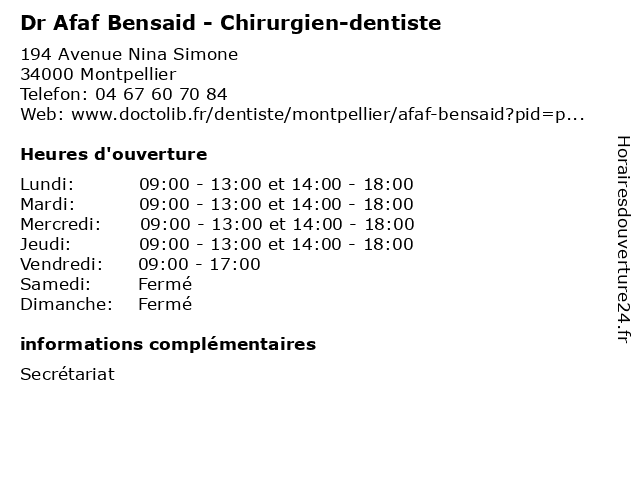 | Lundi | 09:00-13:00 et 14:00-18:00 |