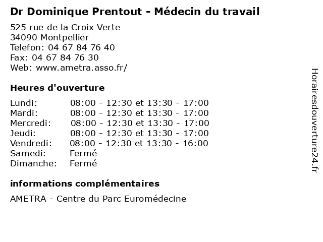 1 Dr Pascale Abeille - Médecin du travail (Distance: 0,00 km) 525 rue de la Croix Verte, 34090 Montpellier abeille, consultation, docteur, dr, du, med, médecin, pascale, traitement, travail 2 Dr Azeddine Bennegouch - Médecin du travail (Distance: 0,00 km) 525 rue de la Croix Verte, 34090 Montpellier azeddine, bennegouch, consultation, docteur, dr, du, med, médecin, traitement, travail 3 Dr Cyril Bernardet - Médecin du travail (Distance: 0,00 km) 525 rue de la Croix Verte, 34090 Montpellier bernardet, consultation, cyril, docteur, dr, du, med, médecin, traitement, travail 4 Assurance Retraite et Santé au Travail (Distance: 5,08 km) 29 Cours Gambetta, 34068 Montpellier administration, assoc, assurance, au, et, retraite, santé, services, services publics, travail 5 Tridentt Travail Temporaire (Distance: 5,84 km) 1189 avenue de l'Europe, 34170 Castelnau le Lez emploi, services, services à la personne, temporaire, travail, tridentt 6 Mastempo Travail Temporaire (Distance: 5,98 km) 114 Avenue de Toulouse, 34070 Montpellier emploi, intérim, mastempo, recrutement, temporaire, travail |