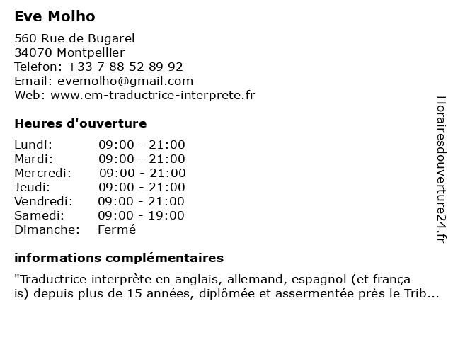 1 Maître Eve Tronel-Peyroz - Avocate (Distance: 2,21 km) 1 place Alexandre Laïssac, 34000 Montpellier avocate, avocats, civils, droits, eve, juridiques, maître, peyroz, tronel 2 Maître Eve Beynet - Avocate (Distance: 2,31 km) 12 rue Jules Ferry, 34000 Montpellier avocate, avocats, beynet, civils, droits, eve, juridiques, maître 3 Maître Marie-Eve Banq - Avocate (Distance: 5,03 km) 1415 avenue Albert Einstein, 34000 Montpellier avocate, avocats, banq, civils, droits, eve, juridiques, marie, maître 4 Maître Eve Masegosa - Avocate (Distance: 6,33 km) 51 impasse des Eglantiers, 34980 Saint-Clément-de-Rivière avocate, avocats, civils, droits, eve, juridiques, masegosa, maître 5 Maître Eve Garrigue - Avocate (Distance: 8,97 km) - Zone Aéroportuaire de Montpellier Méditerranée, 34130 Mauguio avocate, avocats, civils, droits, eve, garrigue, juridiques, maître 6 R . 'eve De Couleurs (Distance: 19,86 km) 381 Rue des Croisades, 34280 La Grande-Motte 'eve, couleurs, de |