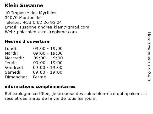 1 David Klein Hypnose (Distance: 1,84 km) 36 Rue Caizergues de Pradines, 34000 Montpellier david, hypnose, klein 2 Dr François Klein - Radiologue (Distance: 4,87 km) 220 Boulevard Pénélope, 34000 Montpellier dr, françois, klein, médecin, médecine, médical, pharmaceutique, radiologie, radiologue, secrétariat, traitement 3 Dr Catherine Klein - Gynécologue médical (Distance: 5,27 km) 128 Rue du Caducée, 34090 Montpellier catherine, consultation, docteur, dr, gynécologue, klein, med, médecin, médecine, médical, secrétariat, traitement 4 Calvin Klein Jeans (Distance: 5,33 km) 2 Place De Lisbonne, 34000 Montpellier calvin, jeans, klein, magasin de vêtements pour femmes, magasin de vêtements pour hommes 5 Susanne Peters - Psychologue (Distance: 35,36 km) 298 Rue Carnot, 30600 Vauvert folie, peters, psychiatre, psychiatrie, psychiatrique, psychologue, susanne |