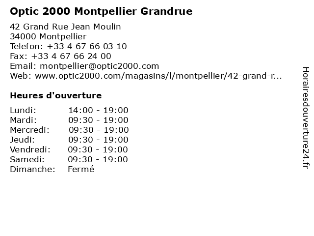 1 Optic 2000 (Distance: 0,00 km) 42 Grande Rue Jean Moulin, 34000 Montpellier 2000, lunettes, optic, santé, solaires 3 Optic Shop (Distance: 0,27 km) 12 Rue Saint-Guilhem, 34000 Montpellier lentilles, lunettes, optic, opticien, optique, shop, solaire, vue 4 Optic Duroc (Distance: 0,31 km) 27 Rue de la Loge, 34000 Montpellier duroc, lentilles, lunettes, optic, opticien 6 |