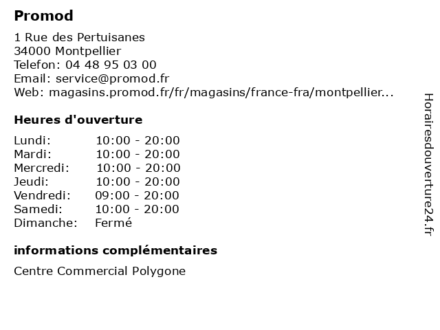 1 Promod (Distance: 3,13 km) . Route de Ganges, 34980 St. Clément de Rivière cafe, enfants, homme, mode femme, promod, restaurant, servicies 2 Promod (Distance: 4,50 km) . Allée de la Condamine, 34430 St Jean De Vedas cafe, deco, enfants, homme, maison, mode femme, promod, restaurant, service 3 Promod (Distance: 4,60 km) . Avenue Des Platanes, 34970 Lattes femme, jeans, mode, pantalons, promod, tendances, vetements 4 Promod (Distance: 5,01 km) Galerie Marchande Du c c Carr, 34430 St Jean De Vedas accessoires, divers, habillement, magasins, promod 5 Promod (Distance: 5,26 km) . Allee de la Condamine, 34430 St.Jean De Vedas beaute, cafe, chaussures, enfants, lingerie, mode femmes, mode hommes, promod, restaurant, sport 6 Promod (Distance: 5,37 km) . Route de Sète, 34430 Saint-Jean-de-Vedas femme, jeans, mode, pantalons, promod, tendances, vetements |