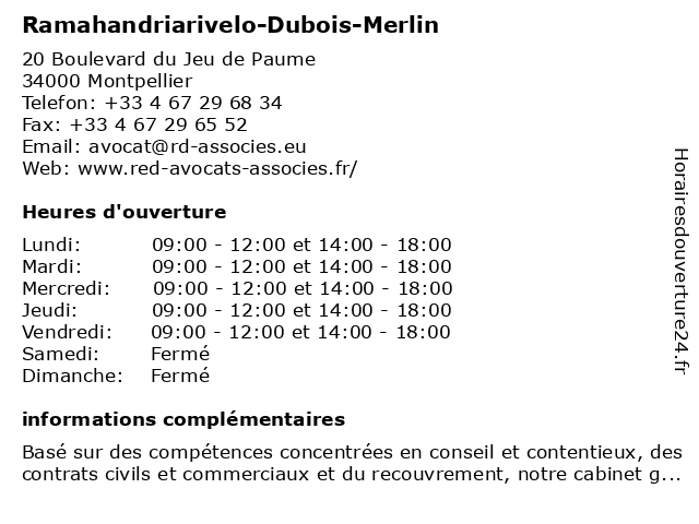 1 Maître Arnaud Dubois - Avocat (Distance: 0,01 km) 20 Boulevard du Jeu de Paume, 34000 Montpellier arnaud, avocat, avocats, civils, droits, dubois, juridiques, maître 2 Pressing Merlin (Distance: 0,91 km) 17 Boulevard Louis Blanc, 34000 Montpellier ameublement, blanchisserie, lavage, laverie, merlin, pressing, retouches, vêtements 3 Benoit Bore Dubois - Psychologue (Distance: 1,50 km) 160 Avenue Jacques Cartier, 34000 Montpellier benoit, bore, dubois, folie, psychiatre, psychiatrie, psychiatrique, psychologue 4 Boucherie Dubois Jérôme (Distance: 1,68 km) 162 Rue Georges Brassens, 34070 Montpellier boucherie, charcuterie, dubois, jérôme, traiteur, viande, volaille 5 Mary Dubois - Psychologue (Distance: 1,82 km) 155 Rue du Pré aux Clercs, 34090 Montpellier dubois, mary, psy, psychiatre, psychologue, sante, soins 6 Dr Georges Dubois - Chirurgien viscéral et digestif (Distance: 1,93 km) 25 Rue de Clementville, 34070 Montpellier chirurgien, consultation, digestif, docteur, dr, dubois, et, georges, med, médecin, médecine, traitement, viscéral |