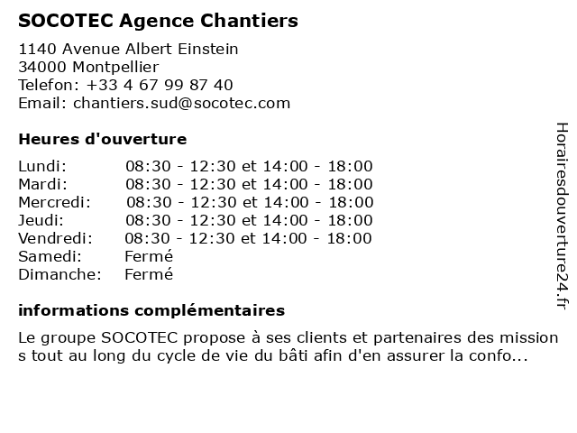 1 SOCOTEC ENVIRONNEMENT (Distance: 0,00 km) 1140 Avenue Albert Einstein, 34000 Montpellier environnement, socotec 2 SOCOTEC Construction (Distance: 0,00 km) 1140 Avenue Albert Einstein, 34000 Montpellier construction, socotec 3 SOCOTEC DIAGNOSTIC (Distance: 0,00 km) 1140 Avenue Albert Einstein, 34000 Montpellier diagnostic, socotec 4 SOCOTEC Équipements (Distance: 0,00 km) 1140 Avenue Albert Einstein, 34000 Montpellier socotec, équipements 6 |