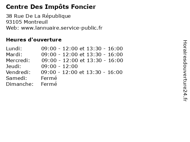 1 Centre Des Impôts Foncier (Distance: 15,74 km) 8 Avenue De L'Europe, 92311 Sevres administration, assoc, centre, des, foncier, impôts, services, services publics 2 Centre des Impôts Foncier de Paris (Distance: 0,57 km) 6 Rue Paganini, 75020 Paris administration, assoc, centre, de, des, foncier, impôts, paris, services, services publics 3 Service des impôts des particuliers du centre des finances publiques (Distance: 0,57 km) 6 rue Paganini, 75020 Paris administration, centre, des, du, etat, finances, impots, impôts, particulier, particuliers, publiques, service 4 Service des impôts des particuliers du centre des finances publiques (Distance: 1,48 km) 33bis Rue Parmentier, 93100 Montreuil administration, centre, des, du, etat, finances, impots, impôts, particulier, particuliers, publiques, service 5 Crédit Foncier de France (Distance: 1,69 km) 11 Bis place de la Nation, 75011 Paris banques, cff, commerciales, credit, crédit, de, foncier, france, nationales 6 Centre Des Impôts (Distance: 1,73 km) 5-7 Avenue De Bouvines, 75116 Paris administration, centre, des, impôts, services publics |