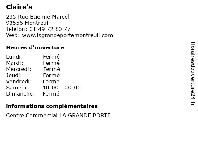 1 Claire's (Distance: 1,15 km) 28 Avenue du Général de Gaulle, 93541 Bagnolet beaute, claire's, femme, jouets 2 Claire's (Distance: 1,22 km) 28 Avenue du General de Gaulle, 93541 Bagnolet accesoires, cafe, chausseres, claire's, enfants, homme, mode femmes, restaurant 3 Claire's (Distance: 5,05 km) 101 Porte Berger, 75001 Paris beauté, bijoux, cheveux, claire's, jouets et objets de collection, mode, sacs, technologie 4 Claire's (Distance: 5,17 km) . Avenue du Général-de-Gaulle, 93117 Rosny-Sous-Bois beaute, cafe, chaussures, claire's, enfants, mode femmes, mode hommes, restaurant, sport 5 Claire's (Distance: 5,18 km) 61 Rue de Rivoli, 75001 Paris beauté, bijoux, cheveux, claire's, jouets et objets de collection, mode, sacs, technologie 6 Claire's (Distance: 5,25 km) 1 Boulevard Saint Michel, 75005 Paris beauté, bijoux, cheveux, claire's, jouets et objets de collection, mode, sacs, technologie |