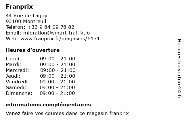 1 Franprix (Distance: 0,45 km) 22 rue Raspail, 93100 Montreuil alimentaire, alimentation, courses, franprix, supermarché, supérette, épicerie 3 Franprix (Distance: 0,85 km) 6 rue Paul Bert, 93100 MONTREUIL alimentation générale, entretien de la maison et de l'hygiène, franprix, franprix magasin, fruits et légumes frais 4 Franprix (Distance: 0,98 km) 3-5 Beaumarchais, 93100 MONTREUIL SOUS BOIS alimentation générale, entretien de la maison et de l'hygiène, franprix, franprix magasin, fruits et légumes frais 5 Franprix (Distance: 1,10 km) 3 Boulevard Davout, 75020 Paris bibi, carte de fidélité, courses, franprix, magasin, produits frais, programme de fidélité, supermarché, épicerie 6 Franprix (Distance: 1,11 km) 3 bd Davout, 75020 PARIS alimentation générale, entretien de la maison et de l'hygiène, franprix, franprix magasin, fruits et légumes frais |