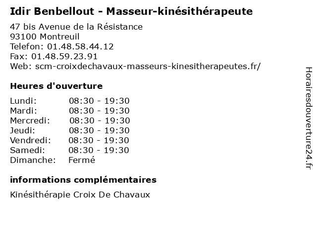2 Serrine Idir - Masseur-kinésithérapeute (Distance: 4,07 km) 14 Rue des Meuniers, 75012 Paris docteur, idir, kine, kinesitherapeute, kinésithérapeute, masseur, serrine 4 Maître Yasmina Idir - Avocats (Distance: 10,77 km) 10 Bis Rue des frères Morane, 75015 Paris avocats, cabinet, conseils, contentieux, idir, juridique, justice, litiges, maître, services, yasmina 5 Dr Idir Ouzaid - Chirurgien urologue (Distance: 13,04 km) 3 Rue de la Paix, 92230 Gennevilliers chirurgien, consultation, docteur, dr, idir, med, médecin, médecine, ouzaid, traitement, urologue 6 Dr Idir Merabet - Médecin généraliste - secrétariat (Distance: 13,75 km) 27 Rue Carle Hébert, 92400 Courbevoie consultation, docteur, dr, généraliste, idir, med, merabet, médecin, médecine, secrétariat, traitement |