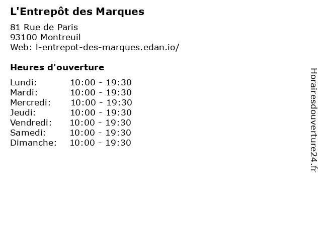 2 Bazar Des Marques (Distance: 4,22 km) a Batiment, 75011 Paris bazar, bd, diverses, générales, marchandises, marques, stock 3 Espace Marques Diffusion (Distance: 4,27 km) 125 Avenue Jean Lolive, 93500 Pantin chaussures, costumes, diffusion, espace, habillement, homme, magasin, marques, mode 4 Centre aquabike l'Entrepôt (Distance: 4,39 km) 21 rue du Faubourg Saint Antoine, 75011 Paris aquabike, aquabiking, centre, l'entrepôt, massages, sauna, spa 5 Restaurant L'Entrepôt (Distance: 4,44 km) 216 Avenue Jean Jaurès, 75019 Paris bar, brasserie, café, entrepôt, l', l'entrepôt, restaurant, traditionnel 6 Maître Diana Segla Marques - Avocate (Distance: 6,07 km) 19 rue de l'Egalité, 93000 Bobigny avocate, avocats, civils, diana, droits, juridiques, marques, maître, segla |