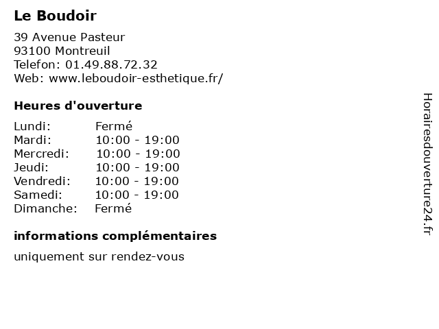 2 Le Boudoir (Distance: 6,89 km) 51 r Du Faubourg Poissonniere, 75010 Paris boudoir, magasins, marchandises, occasion, tarkan, yenilmez 4 Le Boudoir (Distance: 10,55 km) 95 Rue Gabriel Peri, 92120 Montrouge aux, boudoir, douceurs, place, restaurants 5 Boudoir du Regard (Distance: 2,41 km) 8 avenue Joffre, 94160 Saint Mandé beauté, boudoir, cils, du, institut, regard 6 Le Boudoir Parisien (Distance: 4,01 km) 251 Avenue Daumesnil, 75012 Paris boudoir, le, parisien, salon, spa |