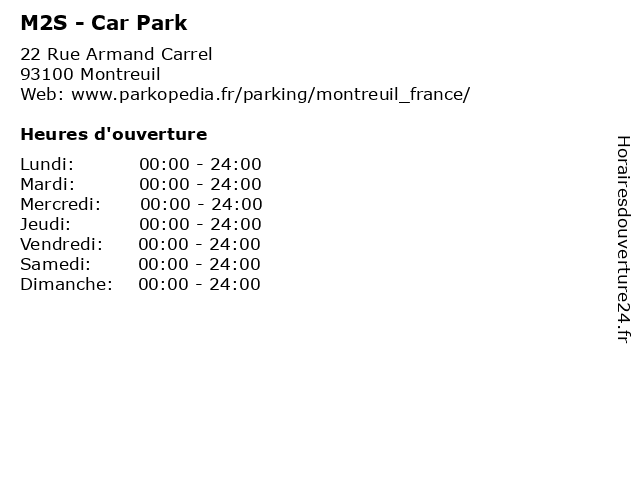 1 M2S - Car Park (Distance: 0,19 km) 4-6 Rue Richard Lenoir, 93100 Montreuil car, m2s, park, parking, services 2 M2S - Car Park (Distance: 0,19 km) 4-6 Rue Richard Lenoir, 93100 Montreuil car, m2s, park, parking, services 3 M2S - Car Park (Distance: 0,19 km) 47 Rue Armand Carrel, 93100 Montreuil car, m2s, park, parking, services 4 M2S - Car Park (Distance: 0,21 km) 272 Rue d'Alembert, 93100 Montreuil car, m2s, park, parking, services 5 M2S - Car Park (Distance: 0,24 km) 16 Rue de la République, 93100 Montreuil car, m2s, park, parking, services 6 M2S - Car Park (Distance: 1,23 km) 23 Rue Édouard Vaillant, 93100 Montreuil car, m2s, park, parking, services |