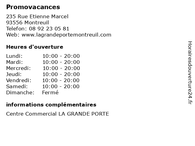 1 Promovacances (Distance: 0,00 km) 235 rue Etienne Marcel, 93556 Montreuil agence, billet d'avion et hôtel pour votre club, promovacances, séjour, voyage 2 Promovacances (Distance: 3,68 km) 4 Place De l'Europe, 94220 Charenton-le-Pont agence, billet d'avion et hôtel pour votre club, promo, promovacances, séjour, vacances, voyage 3 Promovacances (Distance: 3,68 km) 4 Place de L' Europe, 94220 Charenton-le-Pont alimentation, beauté & santé, culture & loisirs, enfants, high-tech, maison & déco, mode, promovacances, restaurants 4 Promovacances (Distance: 3,95 km) . Avenue du Maréchal Joffre, 94124 Fontenay sous Bois beaute, boutiques, chaussures, deco, enfants, mode femme, mode hommes, promovacances, restaurant, sport 5 Promovacances (Distance: 8,54 km) 69 Avenue Aristide Briand, 94110 Arcueil agence, billet d'avion et hôtel pour votre club, promo, promovacances, séjour, vacances, voyage 6 Promovacances (Distance: 10,05 km) - Belle, 94320 Thiais agence, billet d'avion et hôtel pour votre club, promo, promovacances, séjour, vacances, voyage |