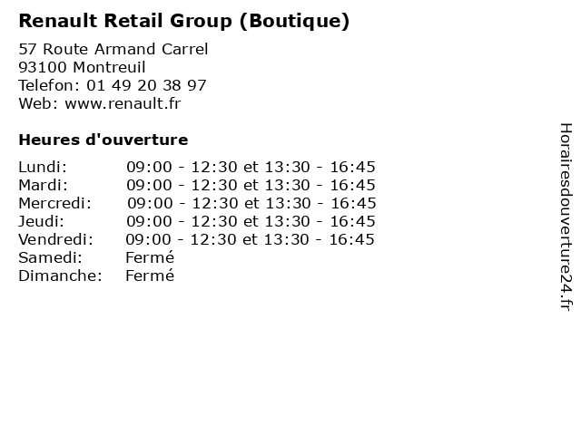 1 Renault Retail Group (Boutique) (Distance: 5,66 km) 13 Avenue General Lerclerc, 93500 Pantin automobiles, boutique, garage, group, motos - concessionnaire, renault, retail 2 Renault Retail Group (Boutique) (Distance: 9,44 km) 29 De Grenelle, 75015 Paris automobiles, boutique, garage, group, motos - concessionnaire, renault, retail 3 Renault Retail Group (Boutique) (Distance: 12,11 km) 8 Boulevard Georges Clemenceau, 92400 Courbevoie automobiles, boutique, garage, group, motos - concessionnaire, renault, retail 4 Renault Retail Group (Vente Vehicule Neuf Z.E.) (Distance: 0,00 km) 57 Route Armand Carrel, 93100 Montreuil automobiles, garage, group, motos - concessionnaire, neuf, renault, retail, vehicule, vente, z.e. 5 Renault Retail Group (Atelier Mecanique) (Distance: 0,00 km) 57 Route Armand Carrel, 93100 Montreuil atelier, automobiles, garage, group, mecanique, motos - concessionnaire, renault, retail 6 Renault Retail Group (Atelier Carrosserie) (Distance: 0,00 km) 57 Route Armand Carrel, 93100 Montreuil atelier, automobiles, carrosserie, garage, group, motos - concessionnaire, renault, retail |