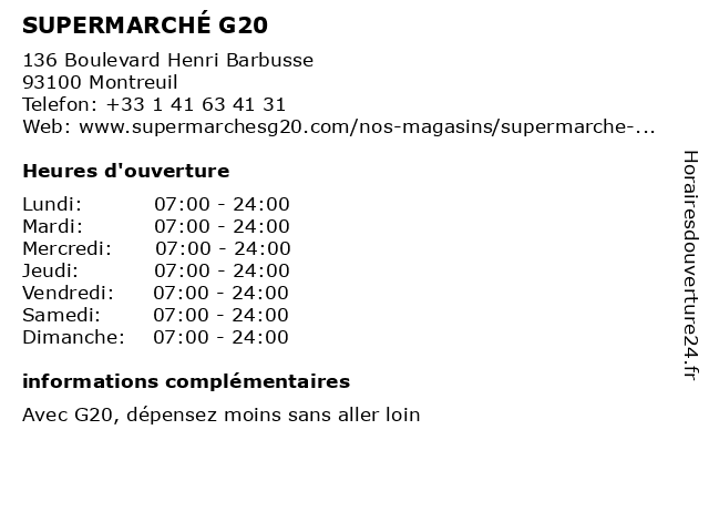 3 SUPERMARCHÉ G20 (Distance: 2,18 km) 245 Boulevard de la Boissière, 93100 Rosny-sous-Bois g20, supermarché 6 |